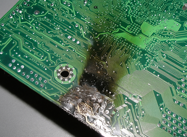 Есть запах гари, виден нагар, вздулись или обуглились компоненты платы — скорее всего, повреждения глубокие.