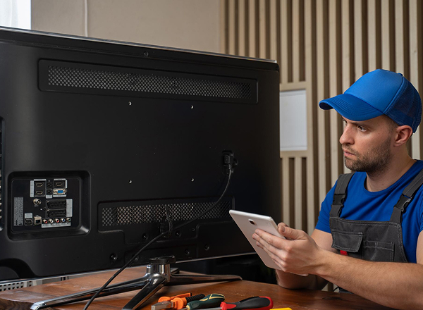 Для проверки мастер подключает тестер подсветки, проверяет питание на T-CON и шлейфы от main board. Определяет, заменяется ли драйвер или повреждение глубже — на уровне матрицы.