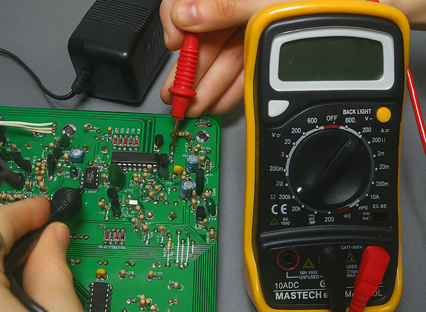 В этом случае мастер проверяет напряжение на входе, прозванивает предохранители, осматривает плату на наличие пробоев или вздутых элементов. Подключает лабораторный блок питания, чтобы измерить потребление тока.